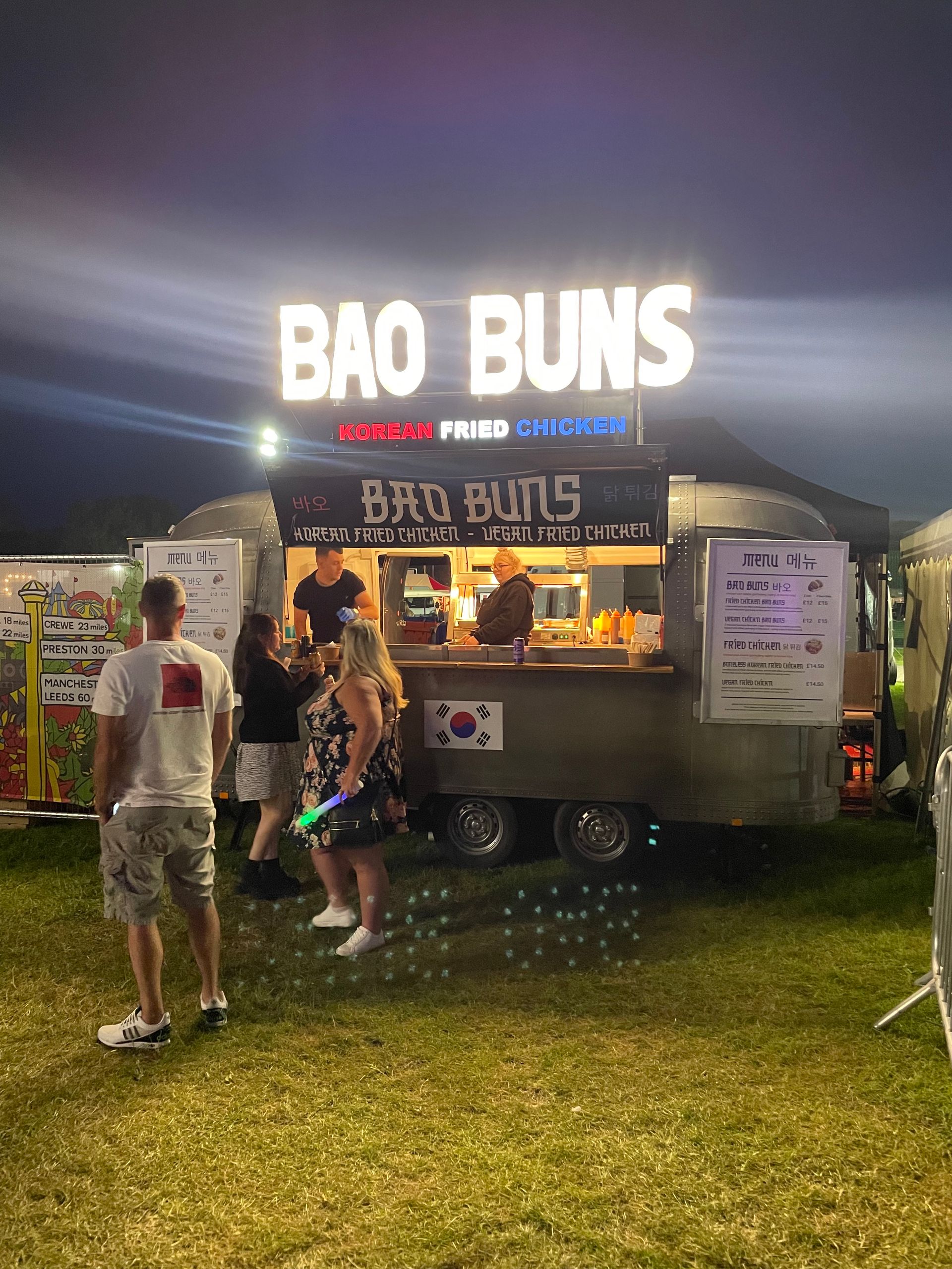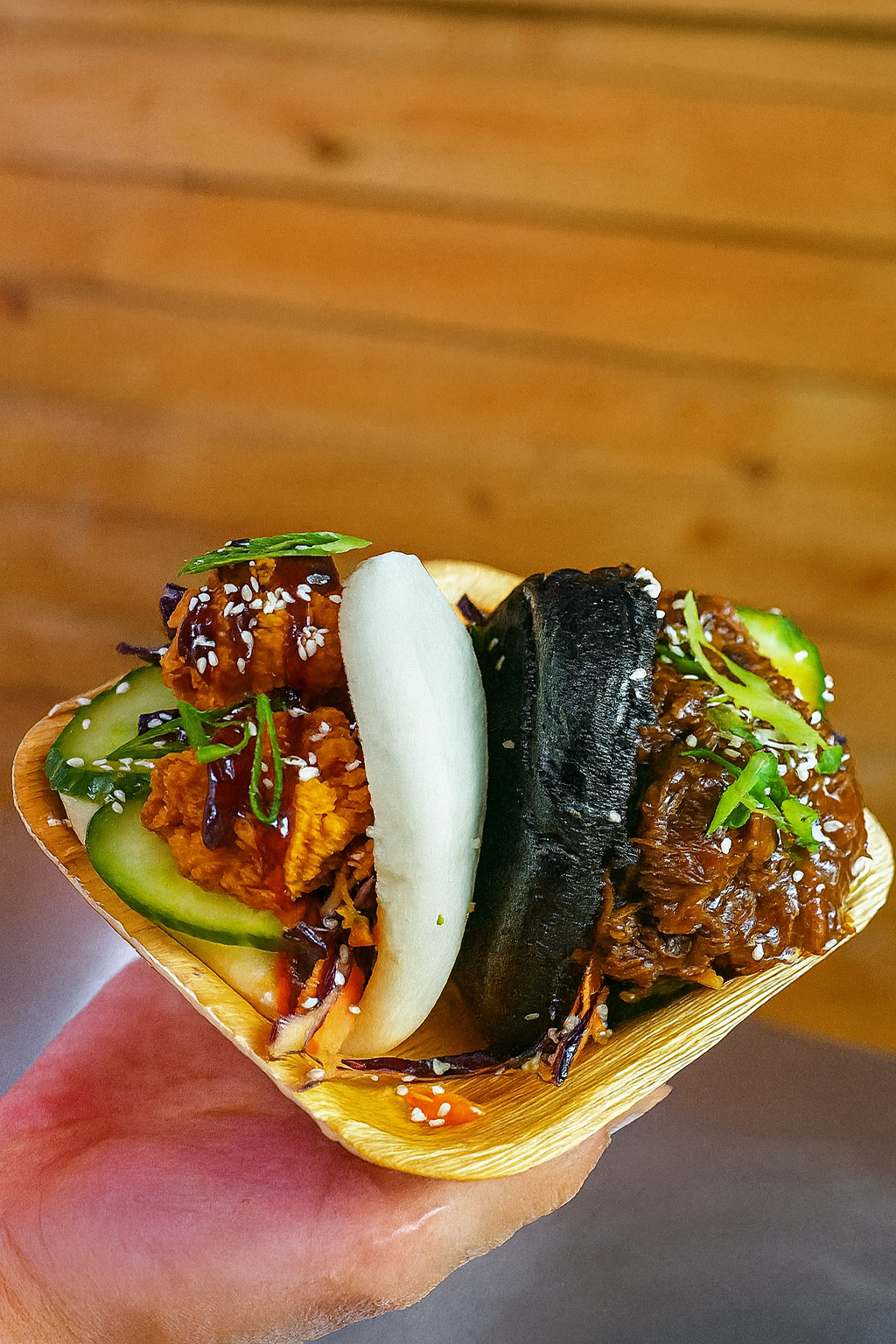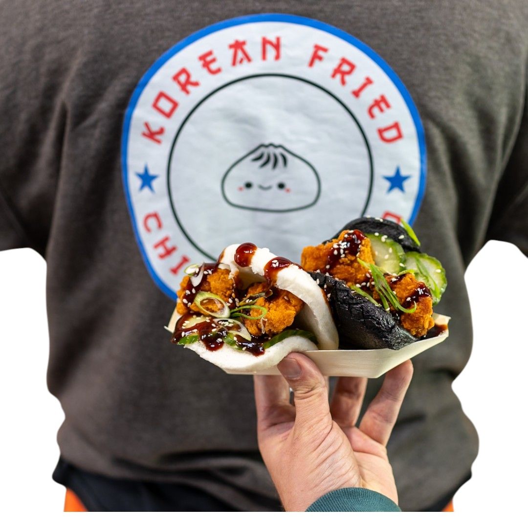 Korean Fried Chicken, 8 Hour Korean BBQ Brisket and Crispy Vegan Popcorn Chicken stuffed Bao Buns, with homemade pickles, sauces and more - all served from our Airstream Food Trailer!